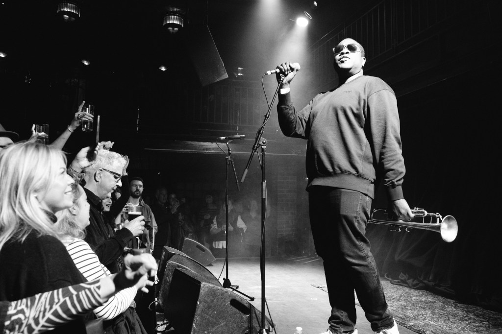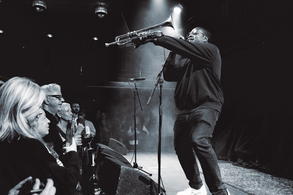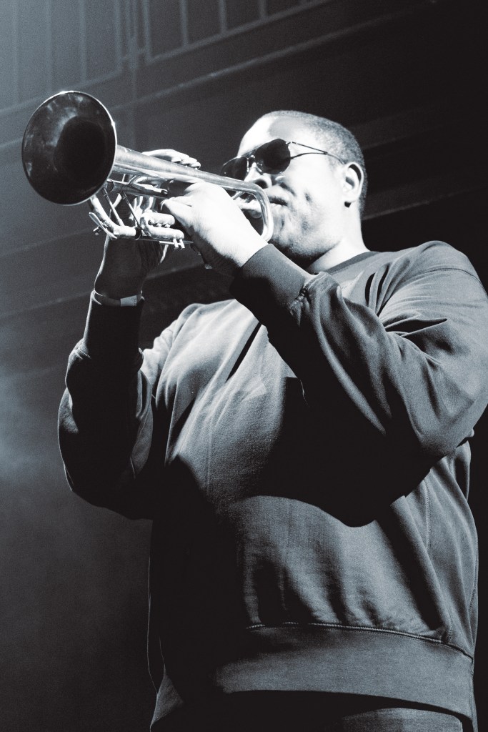 When the moment finally arrives, Thomas boldly strides onto the stage with a spring in his step and an infectious grin on his face. Dressed in all black and trumpet in hand, he immediately launches into ‘Confines’—the title track from his new record. With Grizzle still backing him up on the decks, Thomas dances gleefully between the two microphones at