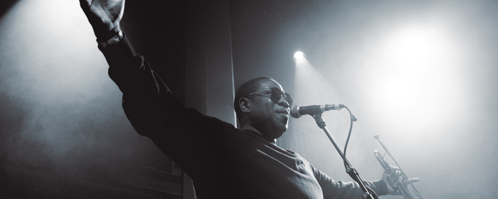 When the moment finally arrives, Thomas boldly strides onto the stage with a spring in his step and an infectious grin on his face. Dressed in all black and trumpet in hand, he immediately launches into ‘Confines’—the title track from his new record. With Grizzle still backing him up on the decks, Thomas dances gleefully between the two microphones at